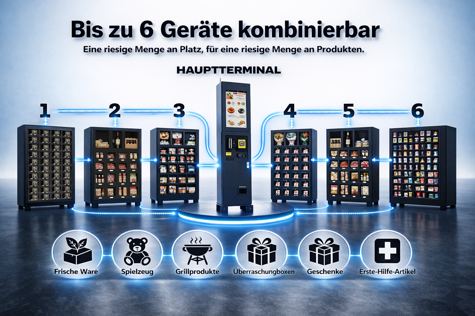 Dank seines modularen Aufbaus lässt sich das Terminal mit 19-, 27-, 40- oder 64-Fach-Modulen kombinieren. Gleichzeitig können bis zu sechs Fächerautomaten angebunden werden, wodurch sich Sortiment, Kapazität und Warenpräsentation flexibel an unterschiedliche Standorte anpassen lassen.